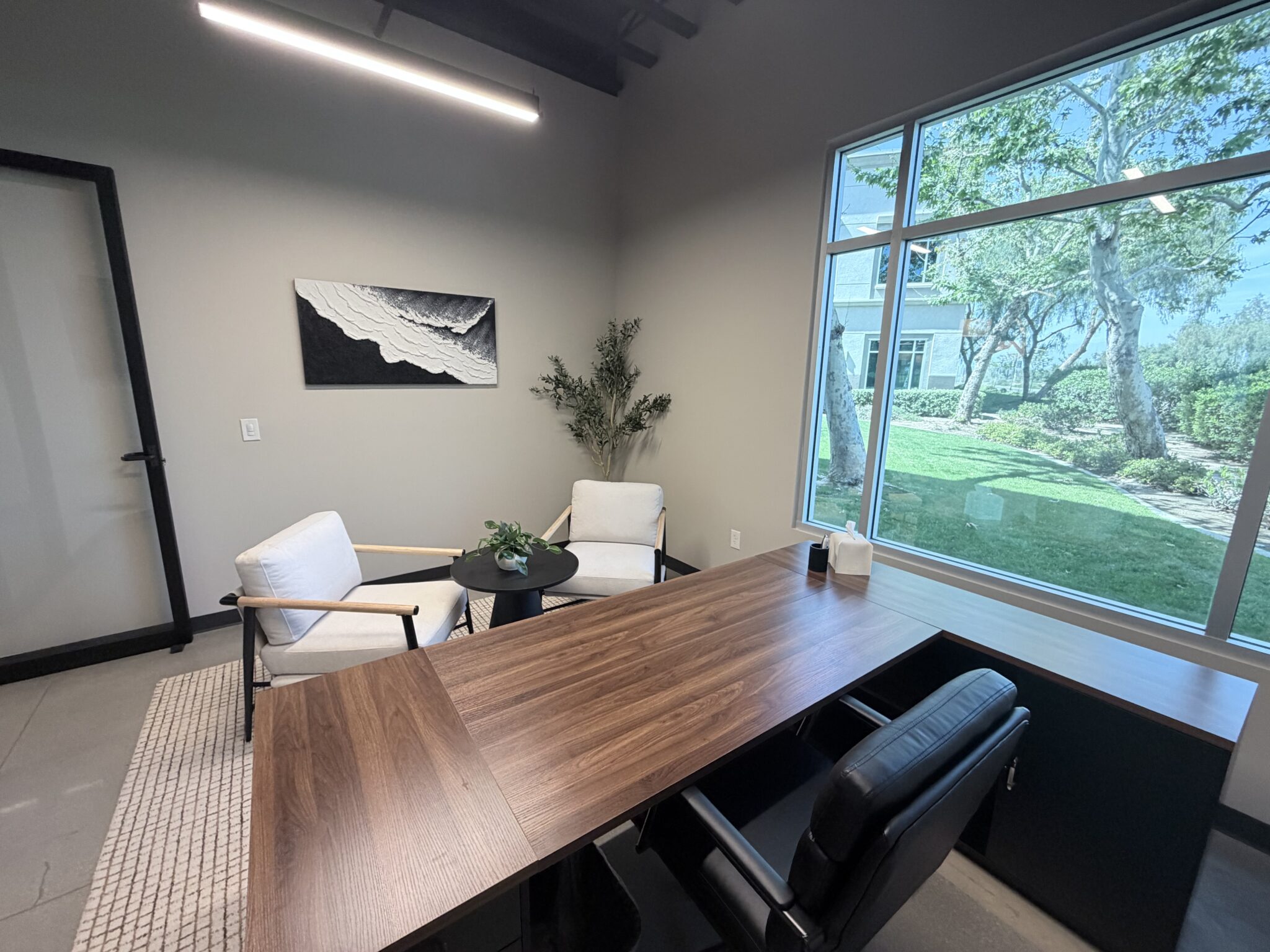 Designed for both comfort and productivity, our Signature Suite offers a refined workspace with a modern, professional atmosphere. Featuring a spacious wooden desk, ergonomic seating, and floor-to-ceiling windows that invite natural light, the suite creates a bright and welcoming environment ideal for focused work or client meetings. Clean lines, contemporary finishes, and a serene outdoor view come together to deliver a space that feels both sophisticated and inspiring.